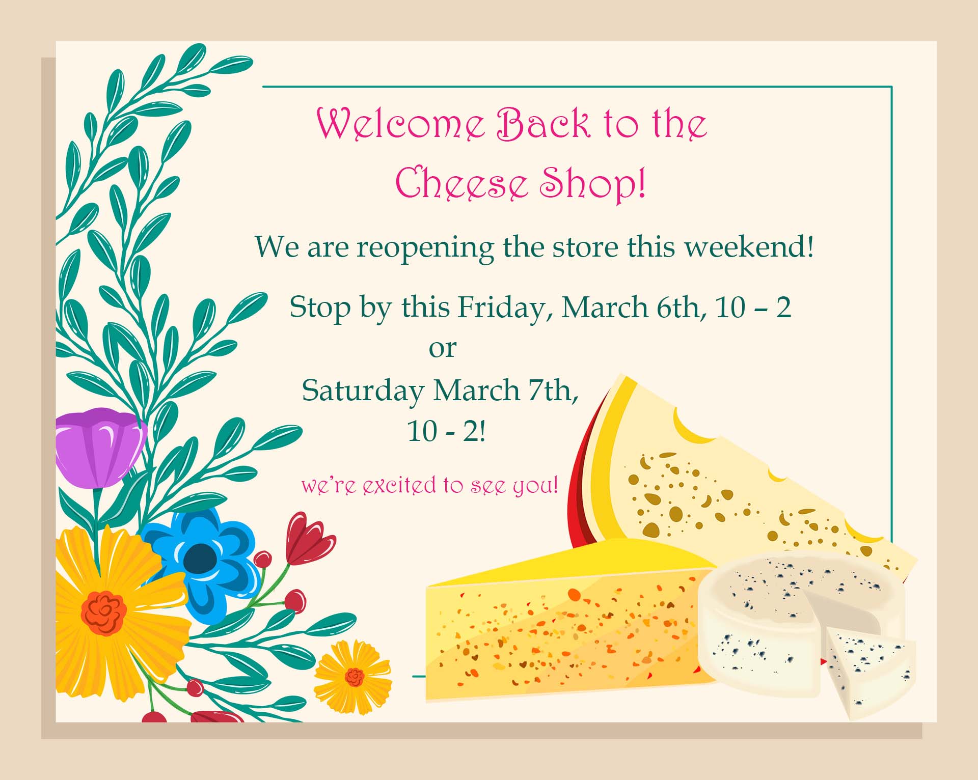 We are reopening March 6th! Our store hours will be Friday and Saturday 10 – 2!